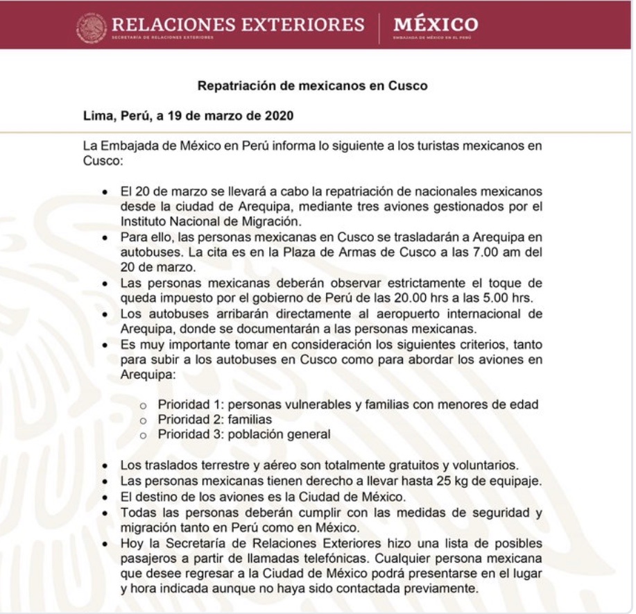 Mediante un comunicado emitido por la Secretaría de Relaciones Exteriores (SRE), se había informado que este viernes saldrían tres vuelos para los connacionales mexicanos varados en Perú, mismos que procederán de la ciudad de Arequipa.